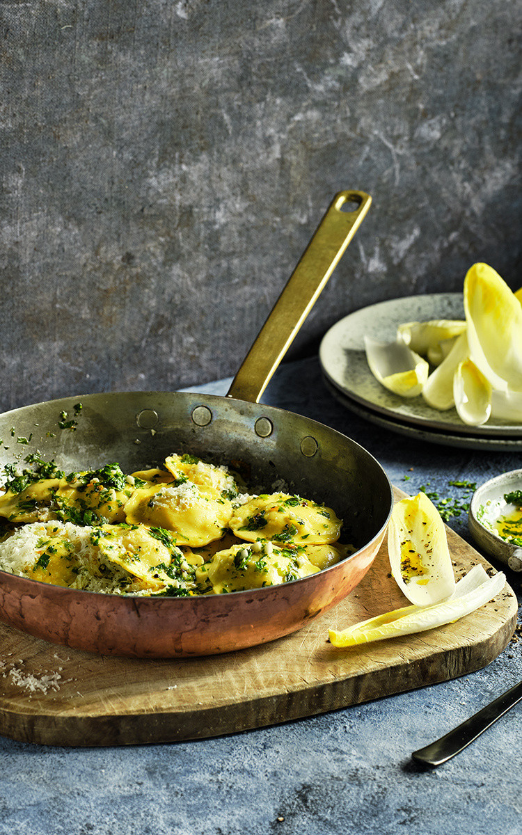 Koka raviolin i rikligt med saltat vatten enligt instruktion på förpackningen. Ta upp raviolin ur kastrullen och blanda försiktigt ner i endive salladen. Lägg upp på tallrikar, strö över parmesanost och servera med resten av endiver.