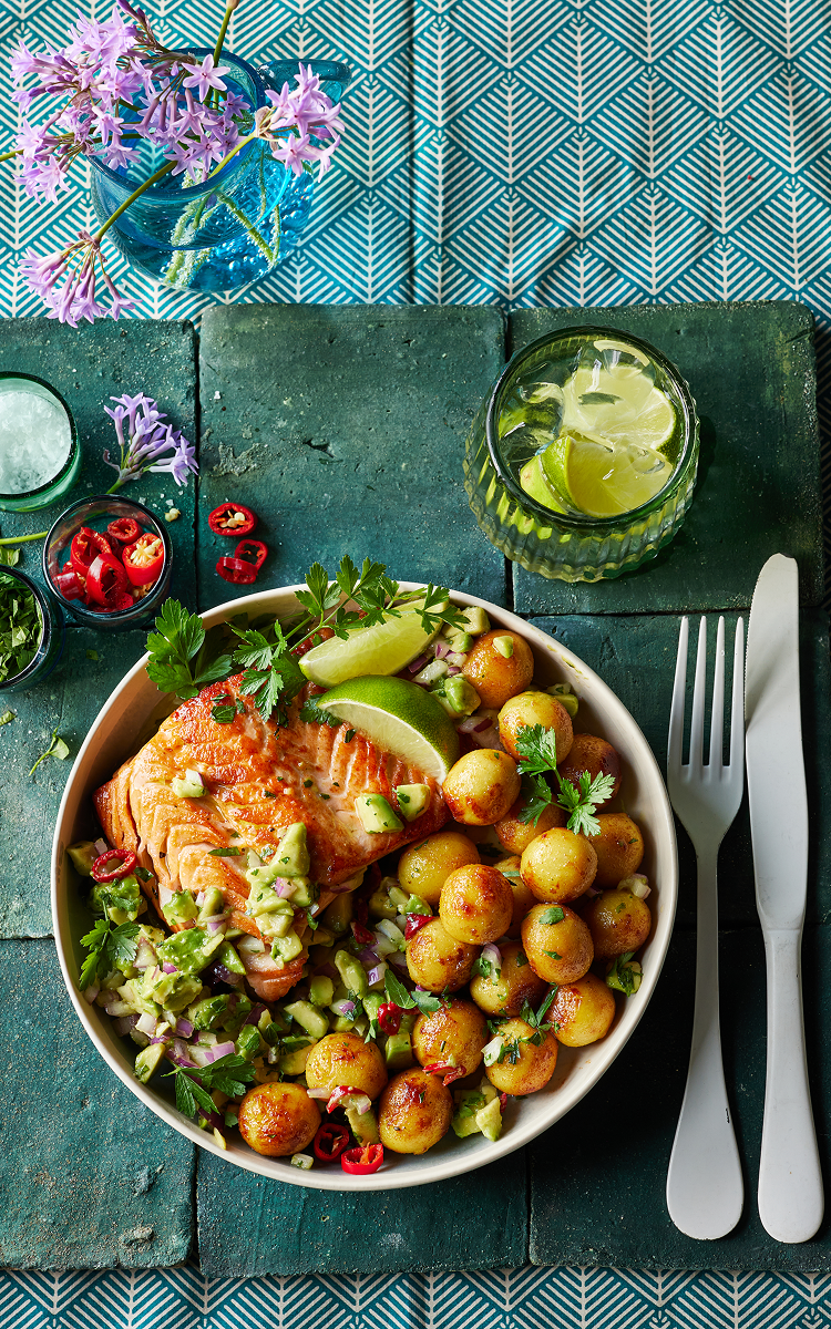 Servera gnocchin med laxskivan och avokadosalladen och garnera med limeklyftor och persilja.