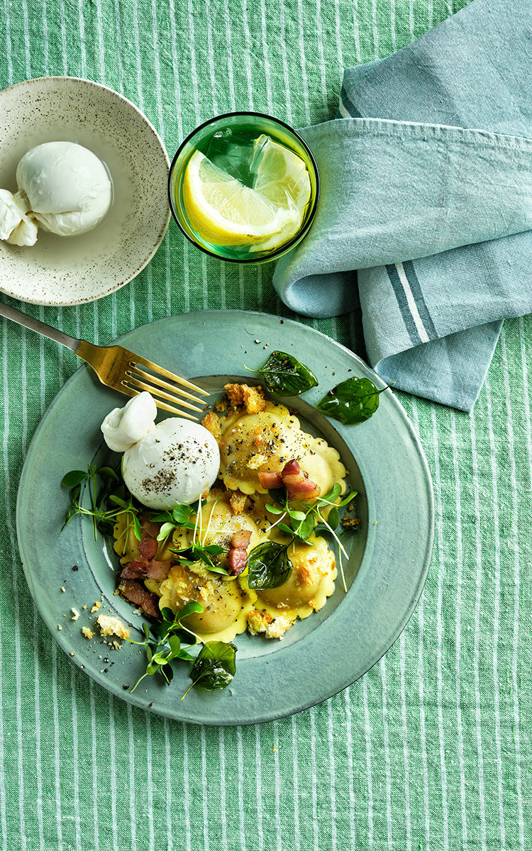 Koka raviolin i en kastrull i rikligt saltat vatten enligt anvisningen på förpackningen, låt dem rinna av med en hålslev och lägg över dem på tallrik, strö över baconet och dekorera med burrata, stekt basilika och krispiga brödsmulor.