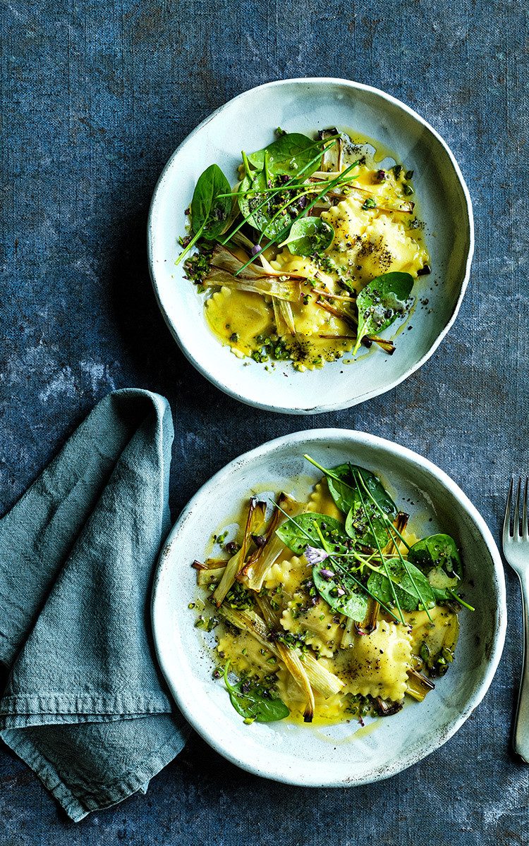 Smält smör med saffran och en droppe kokvatten i en stekpanna. Koka raviolin i rikligt med saltat vatten enligt anvisningen på förpackningen. När raviolin är kokt, häll av dem, lägg dem i pannan och låt dem simma i saffrans smöret någon minut. Servera raviolin med färska spenatblad, en generös näve gräslök nymald svartpeppar och hackade pistagenötter.