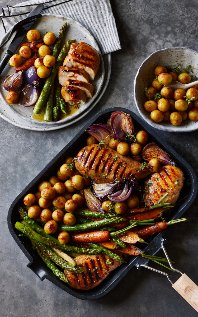 Skala sparris, morötter och rödlök. Koka sparris och morötter i lättsaltat vatten, häll av vattnet och stek dem sedan tillsammans med skivad lök i en panna med olja eller smör tills de får en gyllene yta. Krydda kycklingbrösten och bryn dem på båda sidor i en panna på hög värme. Tillaga klart i ugnen i c:a10 minuter vid 180°C, tillsätt vitlök och rosmarin. Hetta upp en matsked smör i en panna och tillaga gnocchin enligt anvisningarna på förpackningen. Servera den stekta gnocchin med grönsakerna och kycklingen, garnera med färsk timjan eller rosmarin.